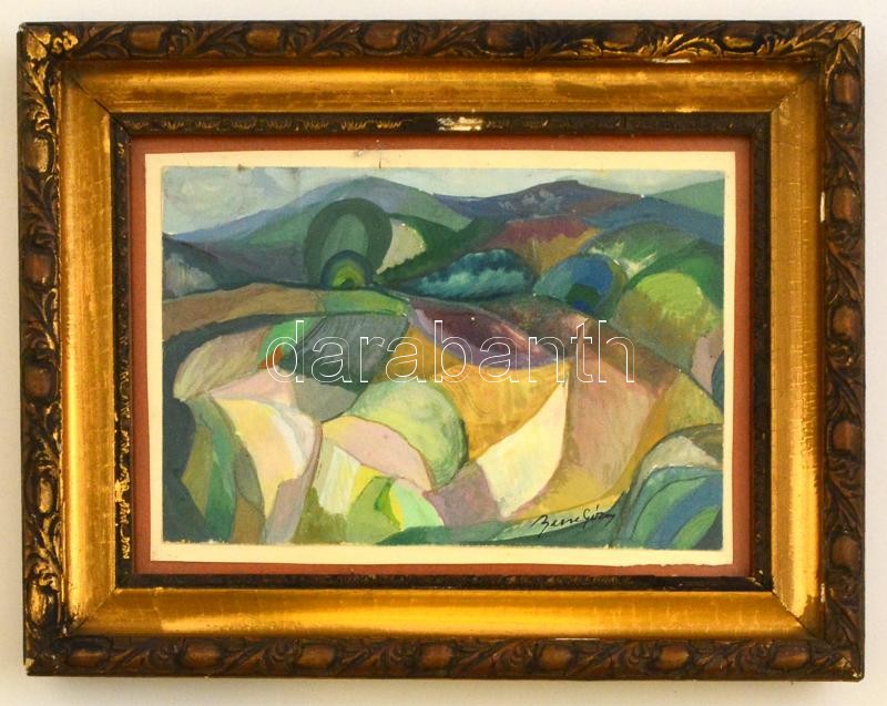Leírás: Bene jelzéssel: Dombok. Tempera, papír, üvegezett keretben, 14×22 cm