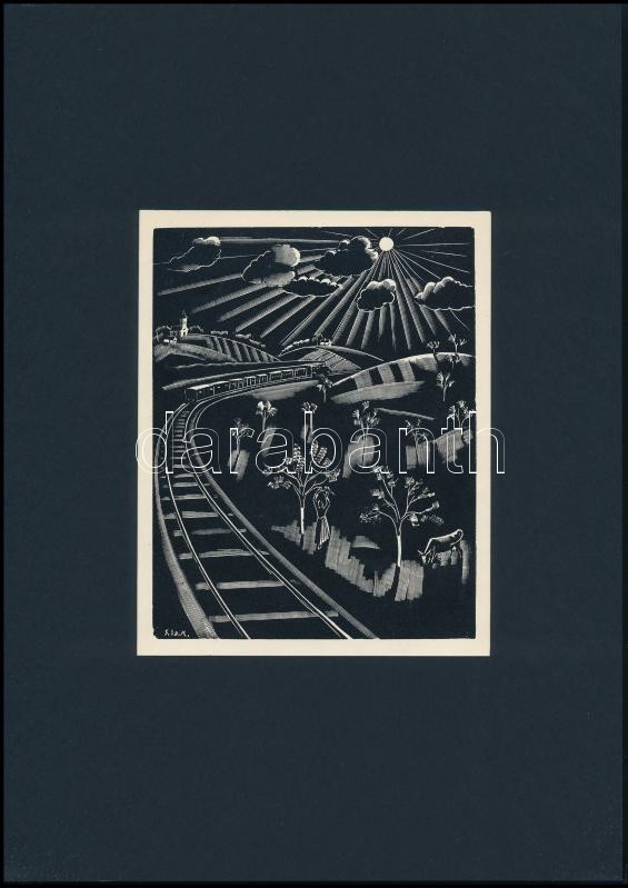 Leírás: Gáborjáni Szabó Kálmán (1897-1955): Vasút, fametszet, papír, jelzett a dúcon, kartonra ragasztva, 14×11 cm