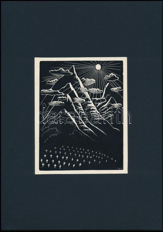 Leírás: Gáborjáni Szabó Kálmán (1897-1955):Hegycsúcsok, fametszet, papír, jelzett a dúcon, kartonra ragasztva, 14×11 cm