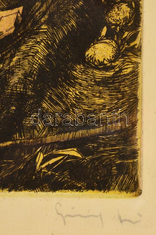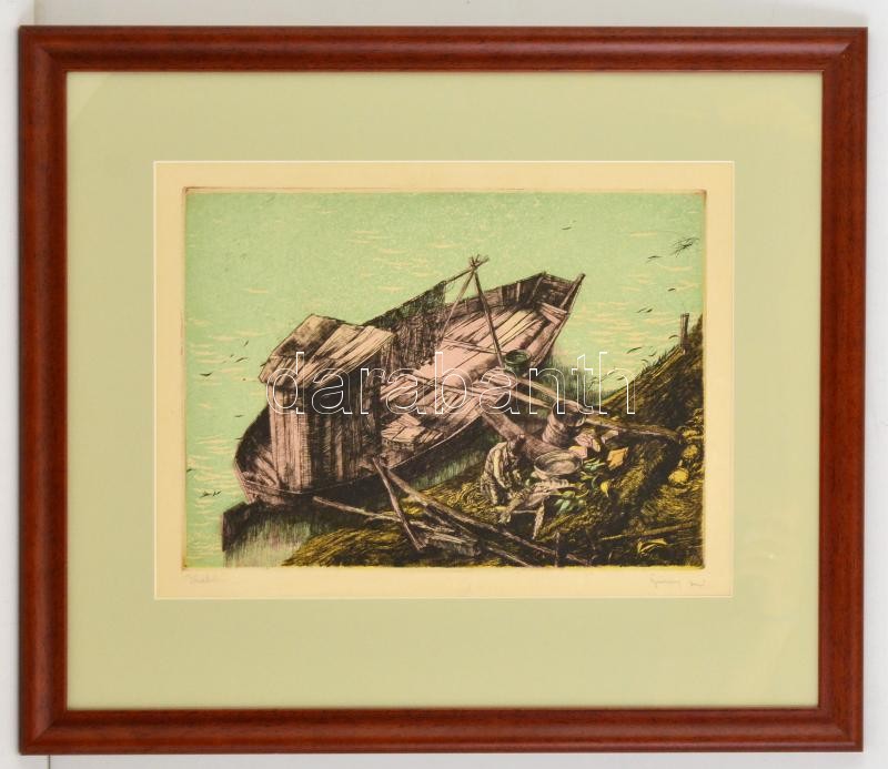 Leírás: Görög Rezső (1930- ): Halász, színezett rézkarc, papír, jelzett, paszpartuban, üvegezett fa keretben,