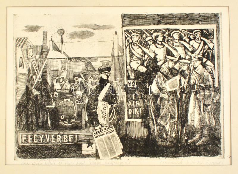 Leírás: Gyulai Líviusz (1937-): Vörös újság. Rézkarc, papír, jelzett, 22×31 cm