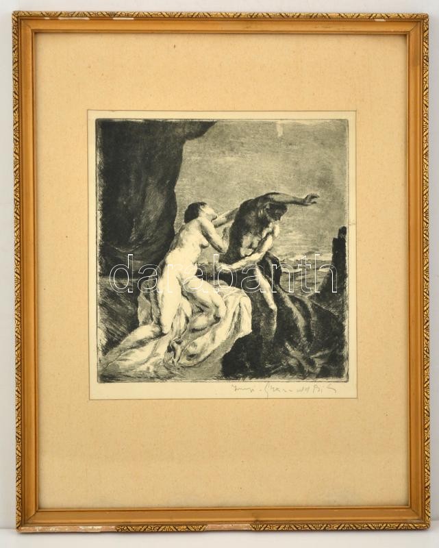 Leírás: Iványi Grünwald Béla (1867-1940) és Prihoda István (1891-1965): József és Putifárné. Rézkarc, papír, jelzett, üvegezett keretben, 25×22 cm