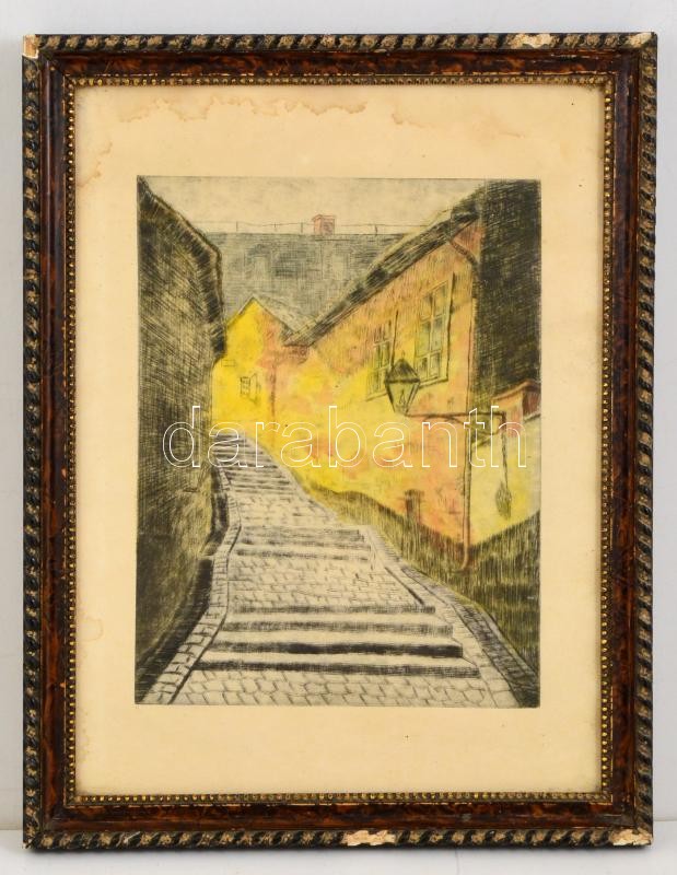 Leírás: Jelzés nélkül: Tabáni utca, színezett rézkarc, papír, kissé foltos, üvegezett fa keretben, 24×18 cm