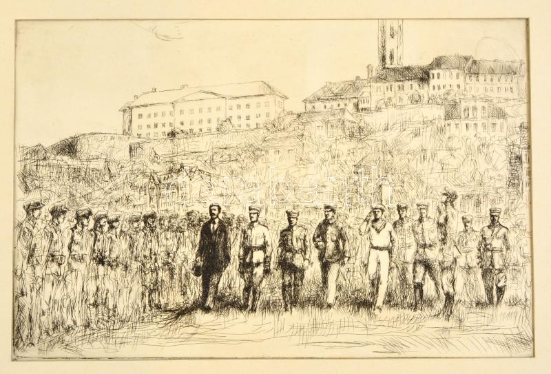 Leírás: Varga Nándor Lajos (1895-1978): Szemle a Vérmezőn. Rézkarc, papír, jelzett, 19×29 cm