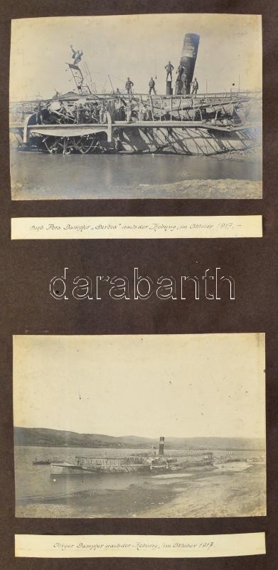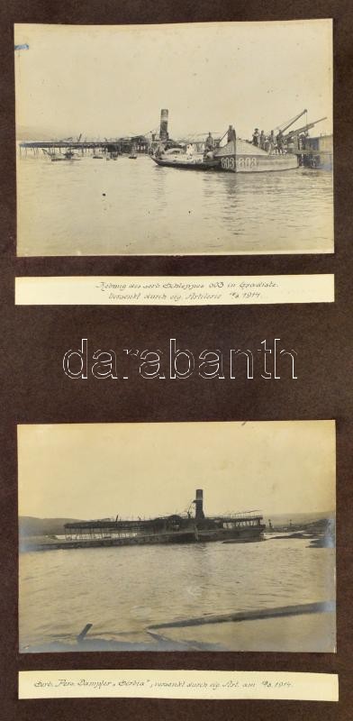 1914 Szerb hajók Gradisténél: 603, Serbia, A szerbek az I. világháború kitörésekor süllyesztették el a hajókat. 4 db érdekes feliratozott fotó (16x12 cm) kartonlapon. / Serbian steamers: Serbia, 603 at gradiste 4 photos on page