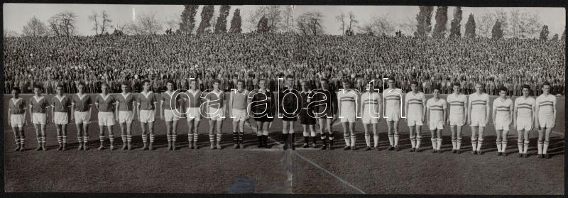 Leírás: Magyar-jugoszláv mérkőzés résztvevői, kétrészes sajtófotó (Novotta Ferenc/Magyar Hírek), hátulján feliratozva, pecséttel jelzett, 12×35 cm