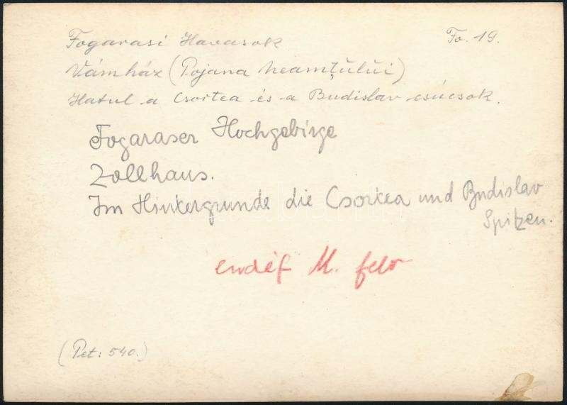 cca 1910 Fogarasi-havasok, vámház, Erdélyi Mór felvétele, hátulján feliratozva, pecséttel jelzett, 11,5×16 cm / cca 1910 Munţii Făgăraş, custom house, vintage photo, with notes on its back, 11,5×16 cm