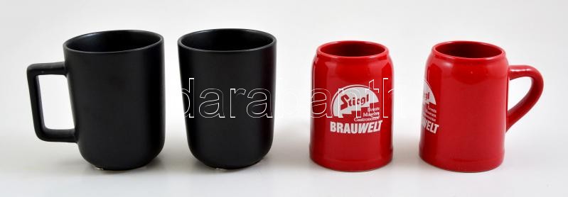 Leírás: 4 db kerámia bögre (közte 2 db kisméretű söröskorsó, egyiken kis lepattanás), 3 db hibátlan, m: 10 cm
