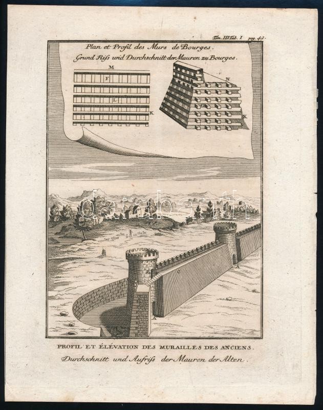Leírás: cca 1750 3 db katonai védmű, várfal metszetrajza, rézmetszet, papír, az "Histoire de Polybe" kötetből 25×20,5 cm