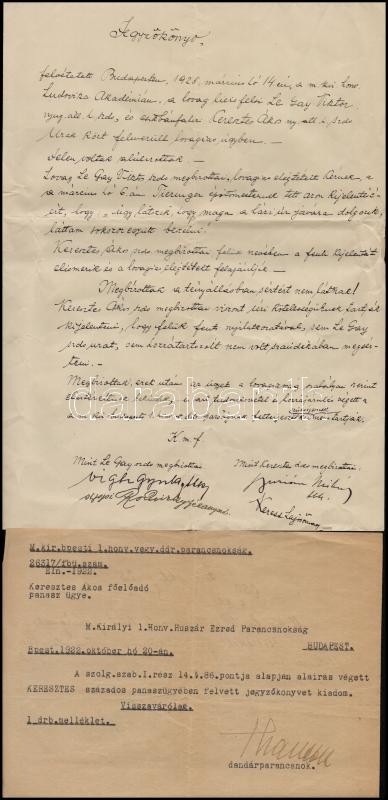 Leírás: 1917-1928 Vegyes okmány tétel: 2 db párbaj jegyzőkönyv, szolgálati jegy, jegyzőkönyv kiadásáról igazolás, stb.