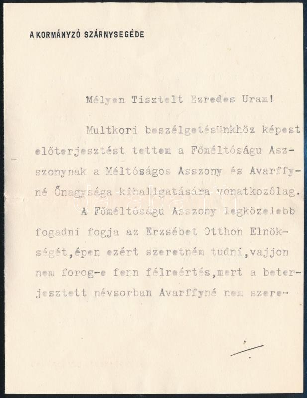 1923 Hardy Kálmán sorhajóhadnagynak (később vezérfőkapitány), a kormányzó szárnysegédjének (Horthy Miklós szárnysegédje 1920-1928) levele Seregélyi Dezső ezredesnek Avarffyné kihallgatása tárgyában, a kormányzó szárnysegédjének borítékjában és papírján, Hardy Kálmán aláírásával.