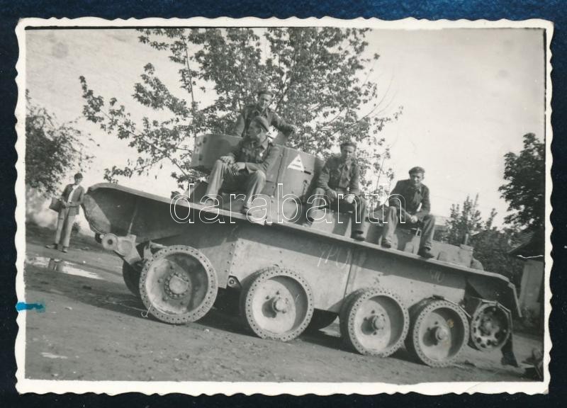 Leírás: 1942 Magyar repülősök egy kilőtt T26-os szovjet tank tetején Kolomeában, Ukrajnában, hátoldalon feliratozva, 6x8,5 cm