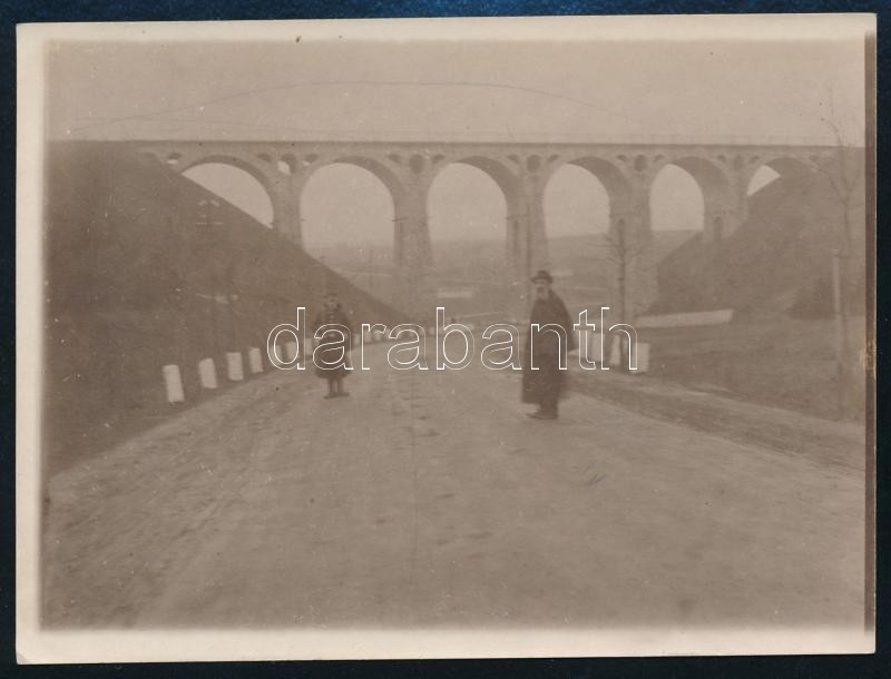 Leírás: cca 1910-1920 Német katona, háttérben viadukttal, fotó, 9×12 cm