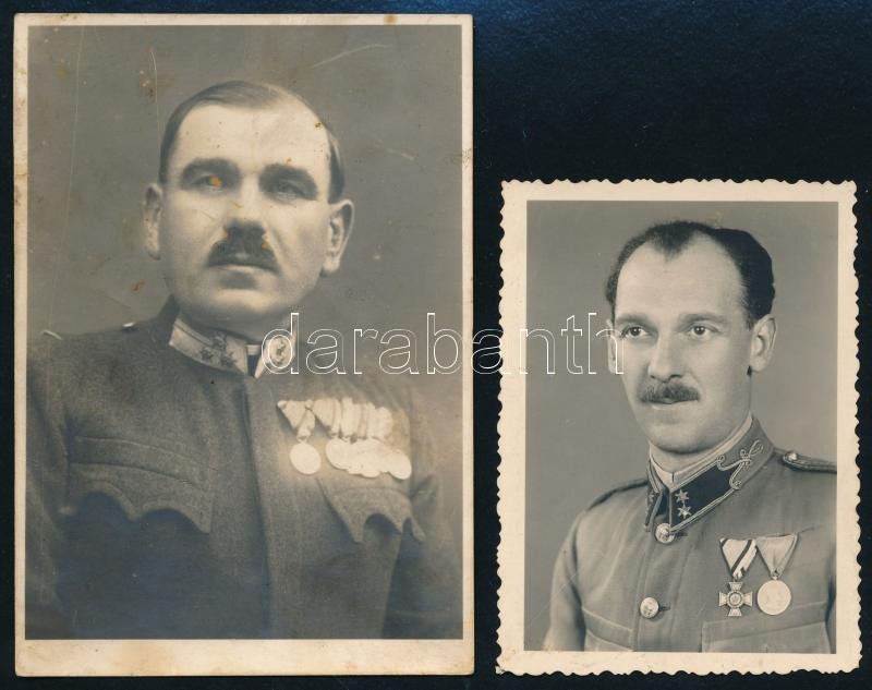 Leírás: cca 1910-1940 Katonák kitüntetésekkel (osztrák-magyar törzsőrmester, Magyar Kir. Honvédség főhadnagy), 2 db fotó, 8,5x6 és 11x8 cm
