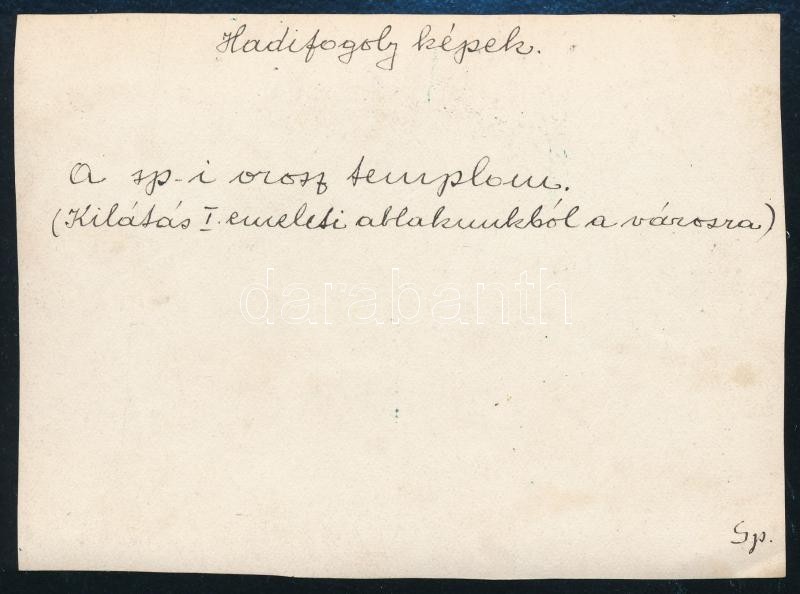cca 1915 Pjeshtschanka POW camp, view towards the temple, photograph, with notes on its back, 8×11 cm