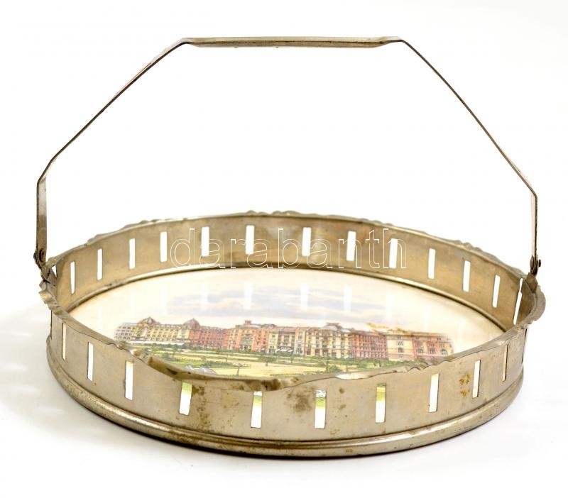 Leírás: Antik fajansz tál Budapest Szabadság tér képpel, fém kerettel és füllel, jelzés nélkül, d: 20 cm