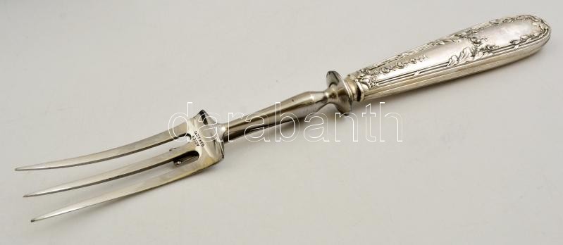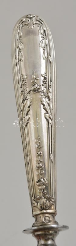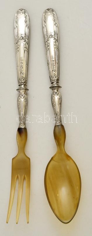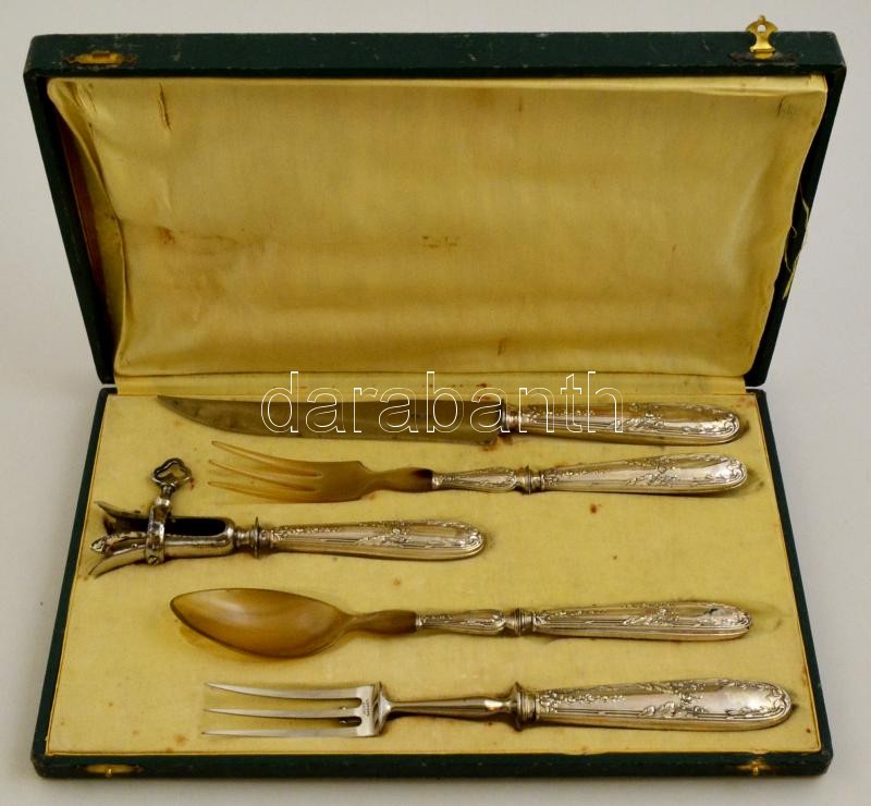 Leírás: Ezüst (Ag.) nyeles saláta és szárnyas szervírozó készlet, eredeti hiányos dobozában, jelzett, h:19-31 cm, összesen:5 db