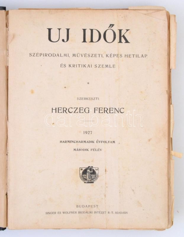 1927 Uj Idők XXXIII. évf. második félév, Szerk.: Herczeg Ferenc, Singer és Wolfner, átkötött félávszon kötés, megviselt állapotban, egy lap szakadt, hiányos, pár lap szakadt, gyűrött, kijár, és lap hiányzik.