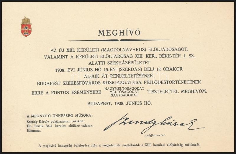 1938 XIII. kerületi Béke tér 1. sz. alatti polgármesteri hivatali székházépület átadó ünnepségének meghívó kártyája, Budapest címerével, nyomtatott aláírással.