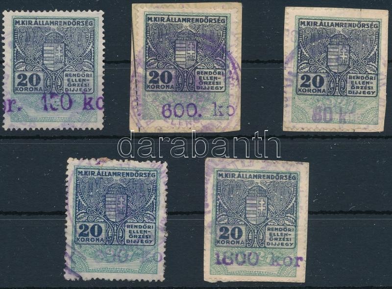 Leírás: 1921/1926 5 klf Rendőrségi illetékbélyeg klf felülbélyegzésekkel