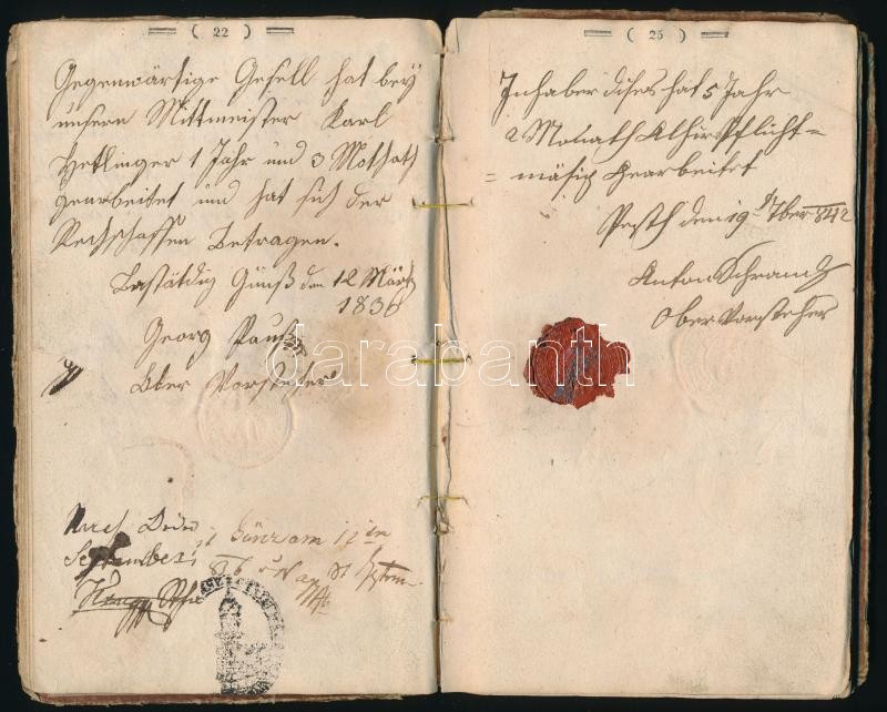 1830-1842 Vándorkönyv, cipész részére, német és cseh nyelven, számos bejegyzéssel, pecsétekkel, közte egy viaszpecséttel, későbbi magyar nyelvű jegyzetekkel, viseltes vászon-kötésben
