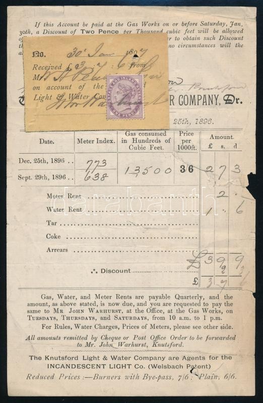 Leírás: 1896-1897 4 db brit számla, közte díszes fejlécesek, okmánybélyegekkel