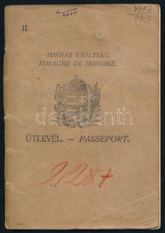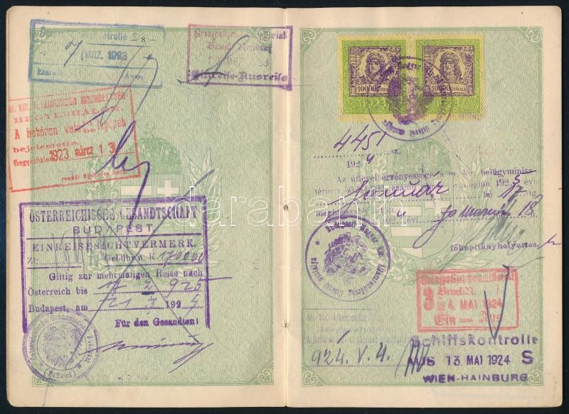 1923 A Magyar Királyság által kiadott fényképes útlevél, okmánybélyegg... https://www.darabanth.com/hu/319-Gyorsarveres/319.0/Festmeny-mutargy-papirregiseg-egyeb/Okmanyok~17/1923-A-Magyar-Kiralysag-altal-kiadott-fenykepes-utlevel-okmanybelyeggel-bejegyzesekkel-~II1760191