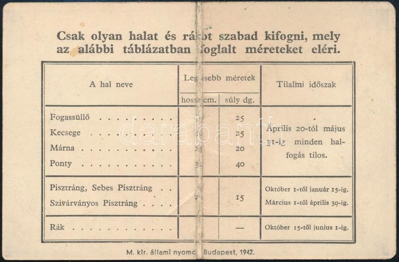 1945 Gárdony-Agárd Villatelepi lakos számára kiállított halászjegy, 5 P benyomott, és 5 P illetékbélyegekkel, pecséttel, középen hajtásnyommal./Fishing ticket