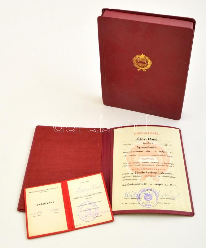 Leírás: 1970 Eötvös Loránd Tudományegyetem tanárának gyémántoklevele, Tanácsköztársasági Emlékérem igazoló okmány, dísztokban
