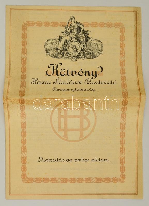 Leírás: cca 1920-1930 Hazai Általános Biztosító díszes életbiztosítási kötvénye, kitöltetlen, hajtásnyommal, jó állapotban