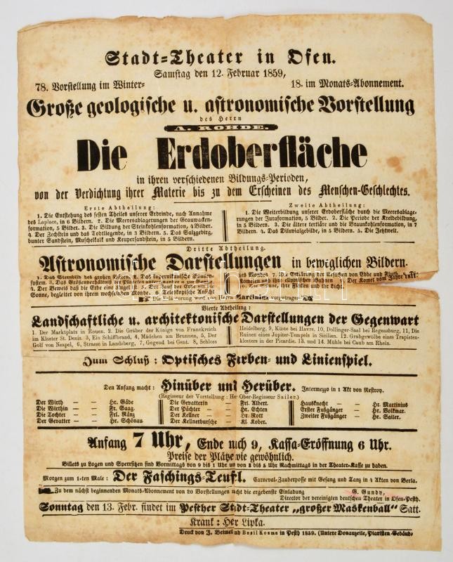 Leírás: 1859 Stadt-Theater in Ofen. Samstag den 12. Februar 1859. Buda, német nyelvű színházplakát. Pest, 1859, Kozma Bazil-ny., szakadt, foltos, 39x31 cm.