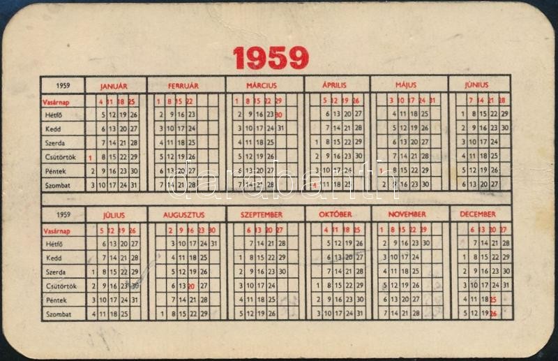 Leírás: 1959 MÉH. Reklámos kártyanaptár