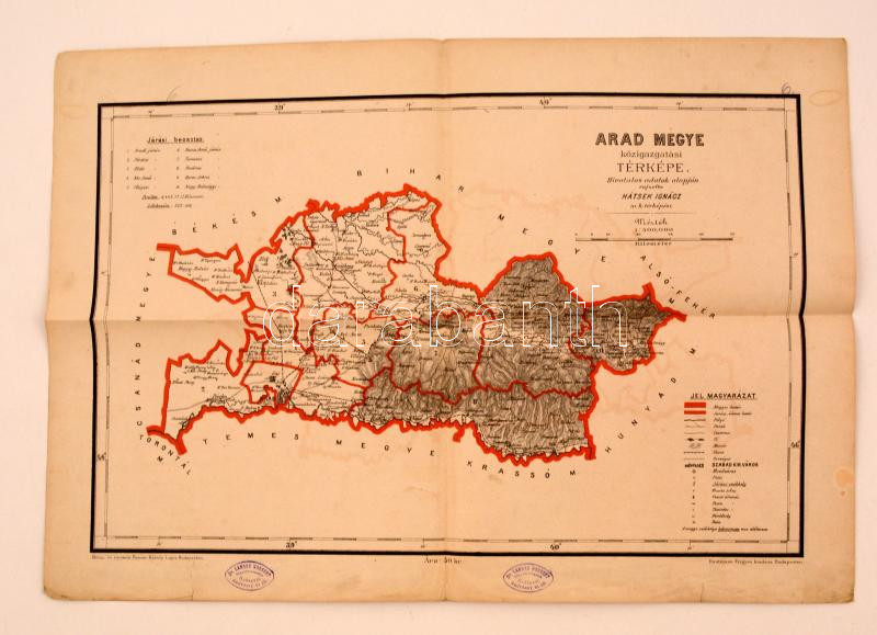 Leírás: Arad megye közigazgatási térképe. Rajz.: Hátsek Ignác. 1:500000, Posner - Rautmann, javított, 37×53 cm