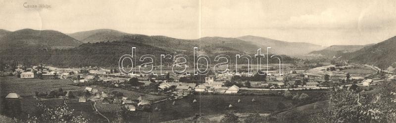 Csucsa, Ciucea; kihajtható panorámalap, fűrésztelep, vasútállomás, templom. Ferencz és Társa utóda, Dunky Elek műterméből / foldable panoramacard with sawmill, railway station, church
