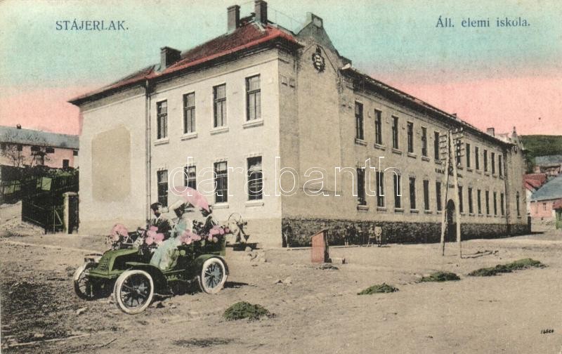 Stájerlak, Staier, Steierdorf; Állami elemi iskola magyar címerrel, automobil esernyős hölggyel. Scheitzner kiadása. Montázslap / school with Hungarian coat of arms, automibile montage