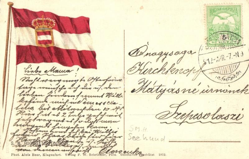 Leírás: SM Hochseetorpedoboot Seehund / Phot. Alois Beer, Verlag F. W. Schrinner 1912 / K.u.K. Kriegsmarine, torpedo boat, K.u.K. litho flag on the backside