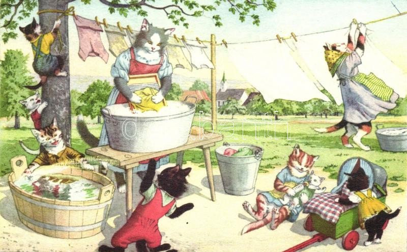 Cat women washing clothes. Max Künzli No. 4732. - modern postcard https://www.darabanth.com/hu/319-Gyorsarveres/319.0/Kepeslapok/Macska~2500090/Cat-women-washing-clothes-Max-Kunzli-No-4732--modern-postcard~II1764295