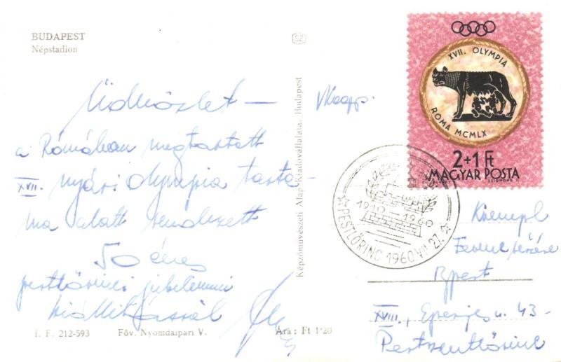 Leírás: Budapest XIV. Népstadion, labdarúgó mérkőzés, foci + 1910-1960 Pestlőrinc So. Stpl. + XVII. Olympia Roma bélyeg