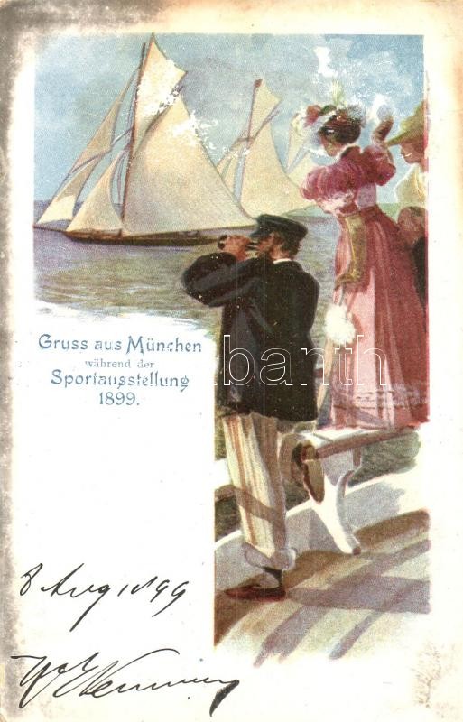 Leírás: 1899 Gruss aus München während der Sportausstellung / Sports Exhibition in Munich, advertisement card (EK)