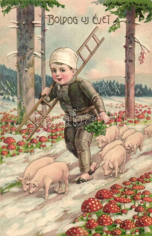 Boldog Új évet! / New Year greeting art postcard with chimney sweeper ... https://www.darabanth.com/hu/319-Gyorsarveres/319.0/Kepeslapok/Udvozlolapok-Unnepek~2500102/Boldog-Uj-evet-New-Year-greeting-art-postcard-with-chimney-sweeper-and-pigs-mushrooms-Erika-N~II1763576