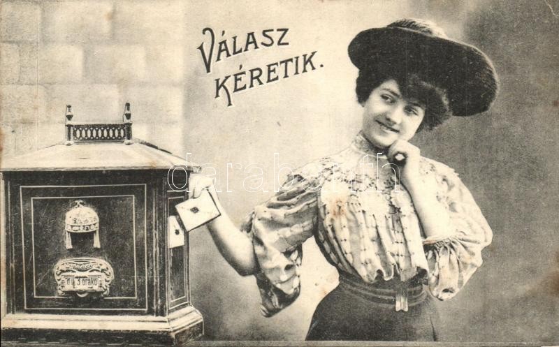Válasz kéretik / Lady with letter and mail box. Greeting card (fl) https://www.darabanth.com/hu/319-Gyorsarveres/319.0/Kepeslapok/Udvozlolapok-Unnepek~2500102/Valasz-keretik-Lady-with-letter-and-mail-box-Greeting-card-fl~II1764210