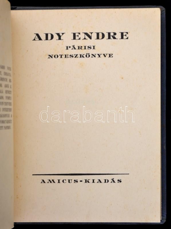 Ady Endre Párisi noteszkönyve (Bp., 1924.) Amicus. 61 p.Első kiadás! A könyvet a költő édesanyja megbízásából adták ki, sajtó alá rendezte Ady Lajos. Egészvászon kötésben. Jó állapotban.