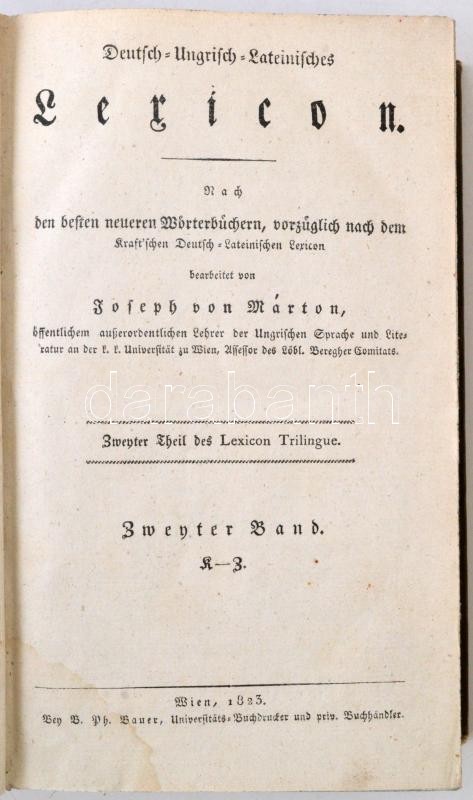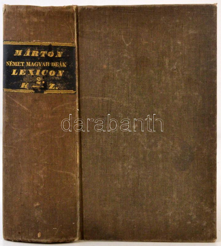 Márton Jó'sef: Német-Magyar-Deák Lexicon. Második Része a' Trilingue Lexiconnak. Második darab K-Z. Bécs, 1823, Bauer B. Filep, 1015 p. Korabeli egészvászon kötés, festett lapélekkel. Német, magyar, latin nyelven. Csak második, töredék, kötet! A gerinc sérült és a borító kopott. De ezt leszámítva jó állapotban.