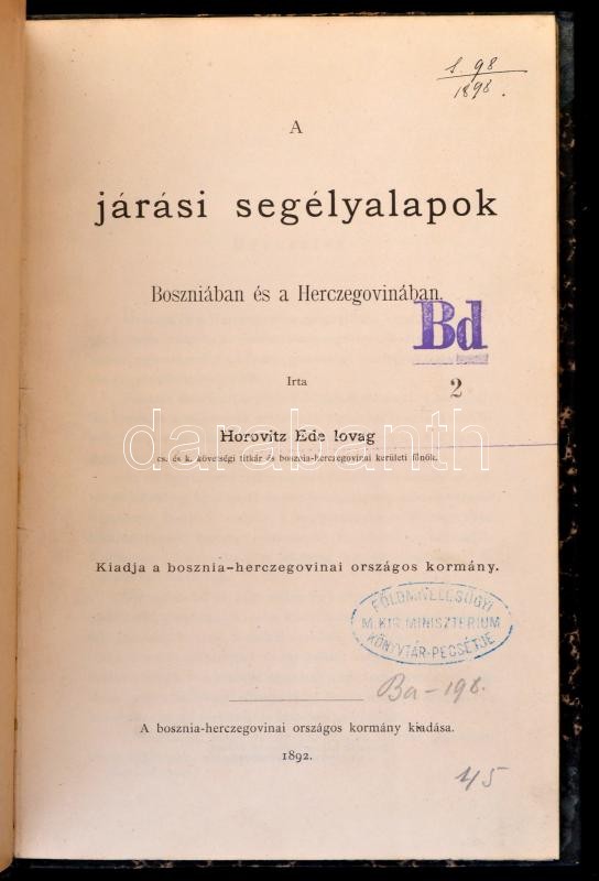 Horovitz Ede: A járási segélyalapok Boszniában és Hercegovinában. 1892, bosznia-hercegovinai országos kormány kiadása. Félvászon kötés, festett lapszélek, kissé kopottas állapotban.