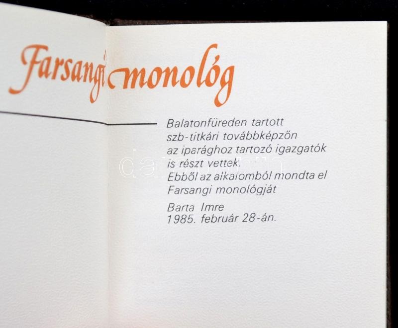 Leírás: Barta Imre: Farsangi monológ, Debrecen, 1985. Kereskedelmi forgalomba nem került.