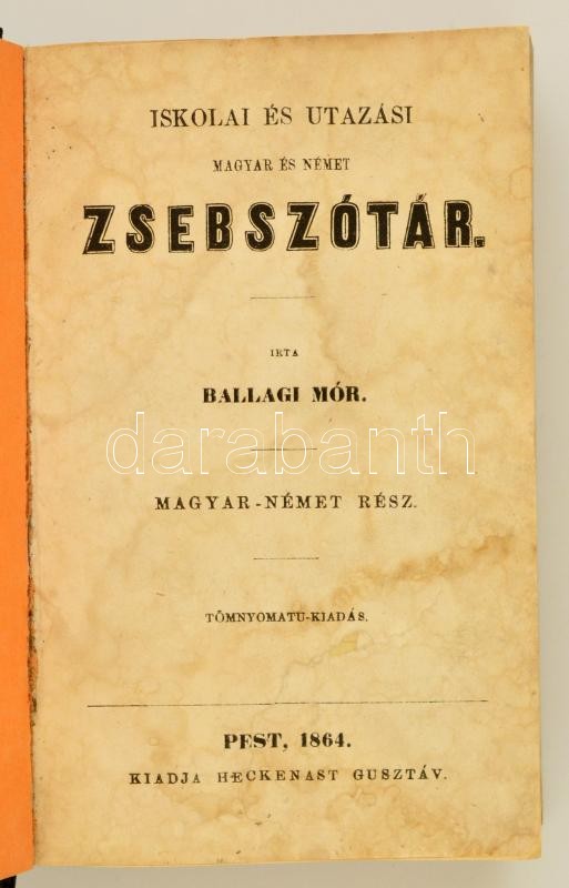 Ballagi Mór: Iskolai és utazási magyar és német zsebszótár. Magyar és német rész, német és magyar rész. (Egybekötve)Pest, 1864, Heckenast Gusztáv, 408+368 p. Átkötött modern félműbőr-kötés, kopottas borítóval.