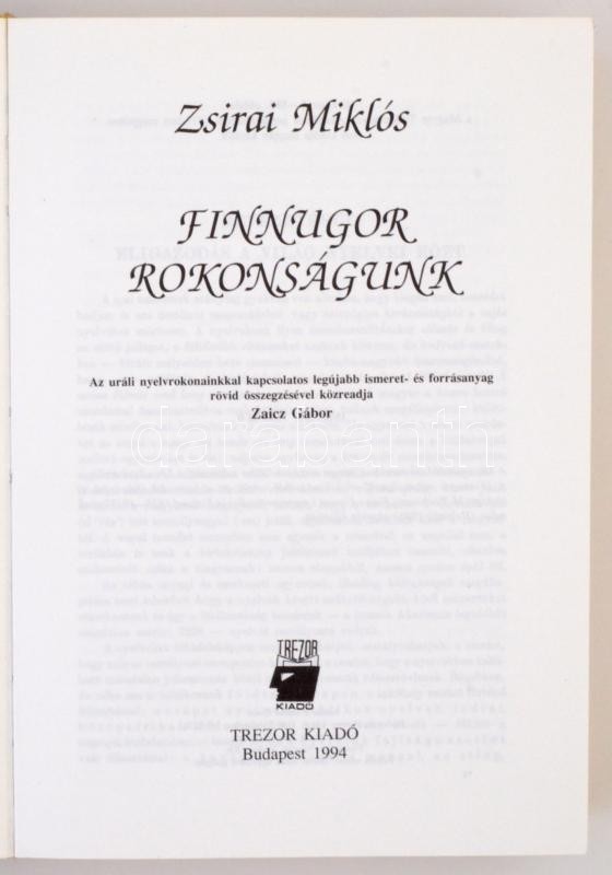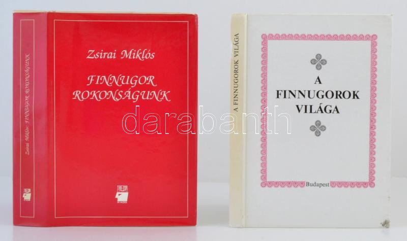 Finnugor témájú könyvek, 2 db: Zsirai Miklós: Finnugor rokonságunk. Budapest, 1994, Trezor Kiadó. Kiadói kartonált papÃrkötés, kiadói papÃr védÅ‘borÃtóban, kissé gyűrött papÃrborÃtóval, szövegközti fekete-fehér fotókkal, és ábrákkal illusztrálva, valamint három térképmelléklettel. A finnugorok világa. A II. Finnugor Világkongresszus tiszteletére. A magyarságkutatás könyvtára XIX. Szerk.: Nanovszky György. Budapest, 1996, augusztus 16-21. Budapest-Moszkva, 1996, Teleki László AlapÃtvány. Kiadói kartonált papÃrkötés, a borÃtó egyik sarkánál kisebb sérüléssel, szÃnes fotókkal, táblázatokkal, a finnugor nemzetek zászlóival és cÃmereivel, térképekkel illusztrálva.