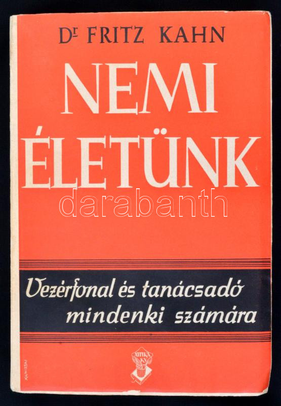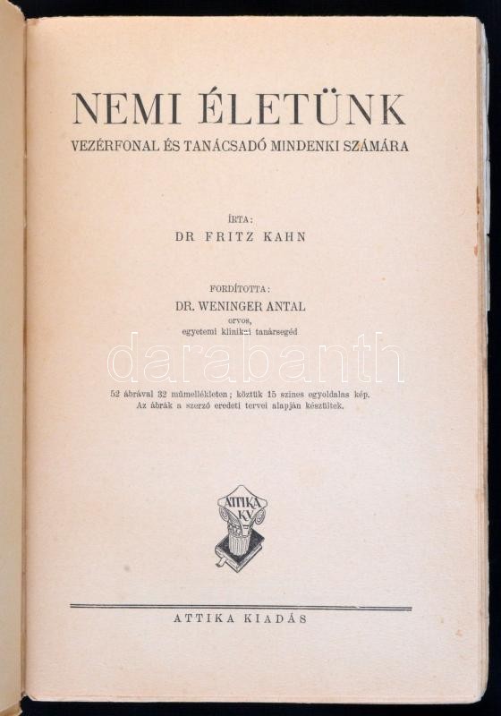 Kahn, Fritz: Nemi életünk. Vezérfonal és tanácsadó mindenki számára. Ford. Weningar Antal Bp. (1943.) Attika. 380 l. 32 t. Kiadói egészvászon-kötésben, eredeti védőborítóban