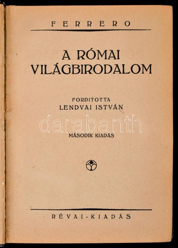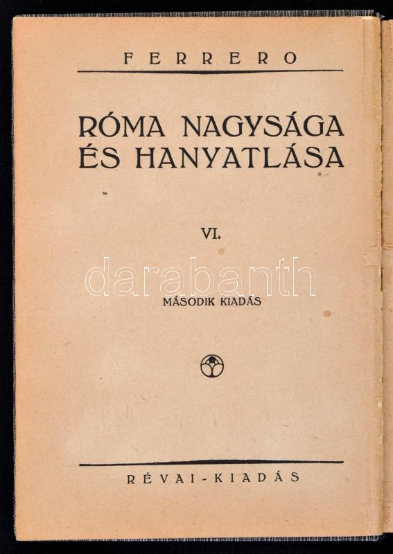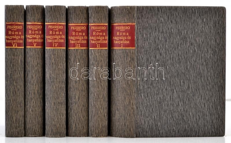 Ferrero: Róma nagysága és hanyatlása I-VI. kötet. Fordította: Lakatos László, Lendvai István. Világkönyvtár 22-24,30-32. kötet. Bp.,é.n., Révai. Második kiadás. Korabeli átkötött egészvászon-kötés, változó állapotban, az I. kötetben a címlap kijár, az I. és III. kötetben javított lapokkal.
