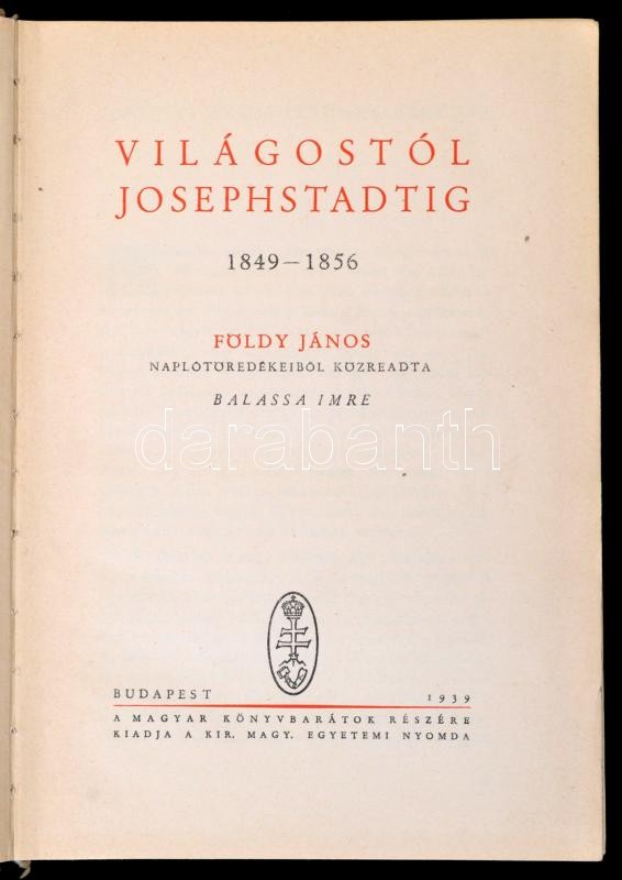 Földy János: Világostól Josephstadtig. 1849-1856. Földy János naplótöredékeiből közreadta Balassa Imre. Bp, 1939, Kir. Magy. Egyetemi Ny. Számos egész oldalas rajzzal illusztrálva. Kiadói egészvászon-kötésben.